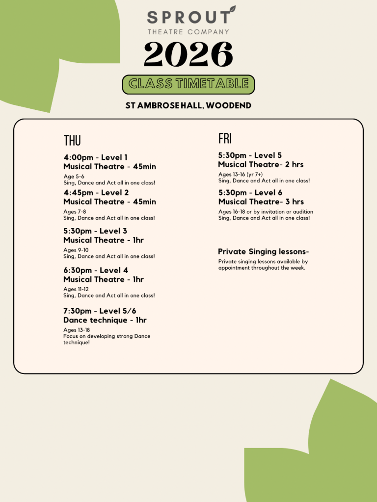 To book in for a Private Singing lesson contact sproutmusicaltheatre@gmail.com